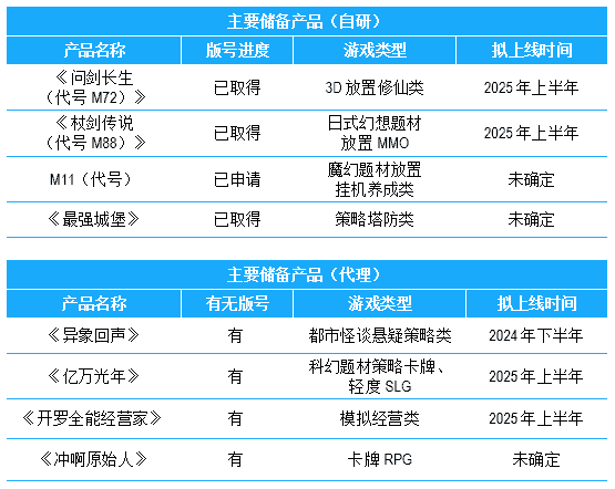 公司储备多款新品,,,,期待为玩家解锁更多新鲜体验,,,,部分产品如下表所示:::